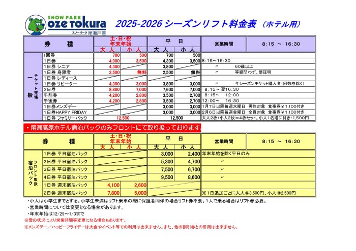 正規宿泊料金(2025-2026年ウィンターシーズン)